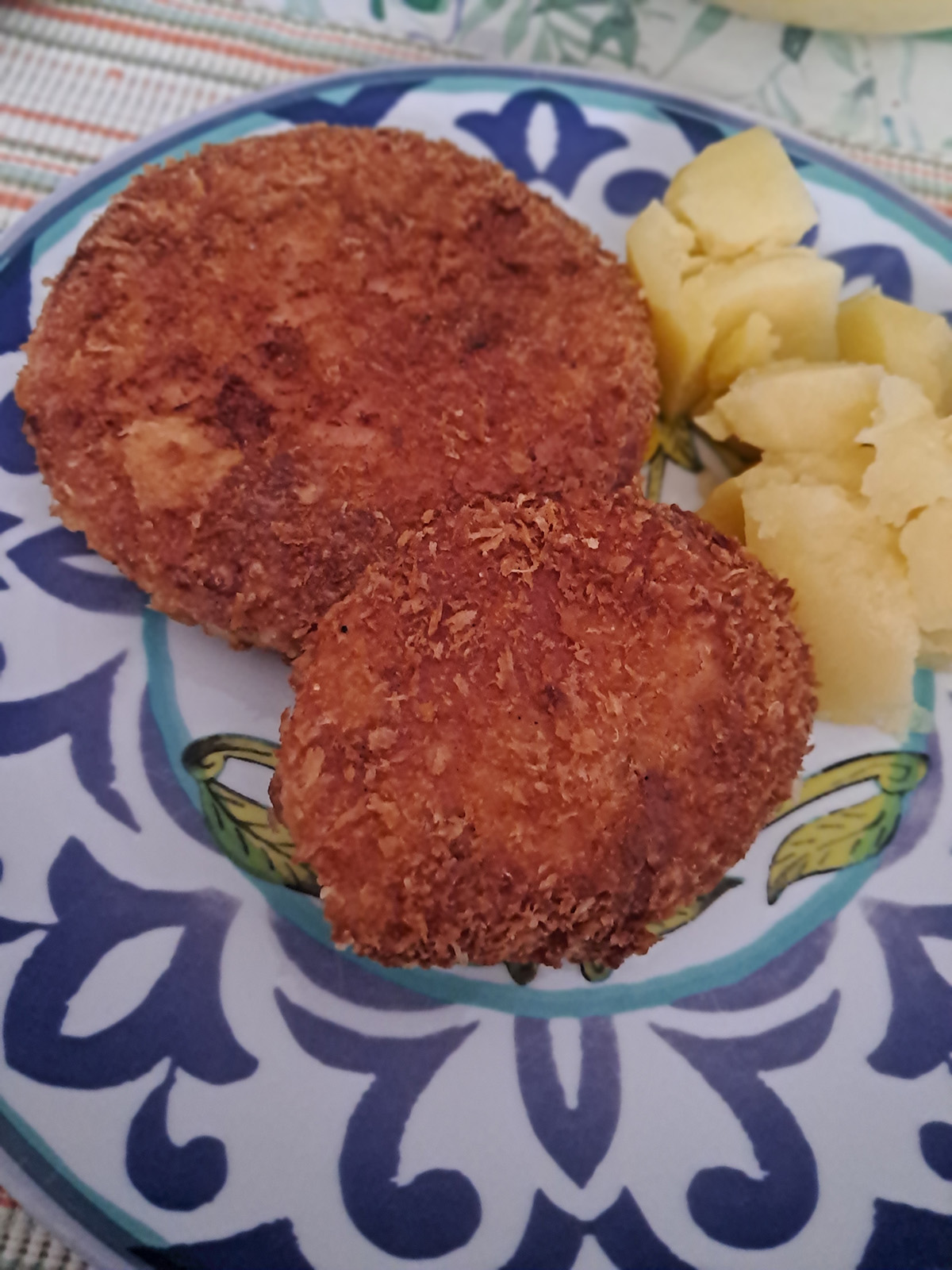 Każdy plaster obtocz kolejno w mące, jajku i mieszance panko z parmezanem.
